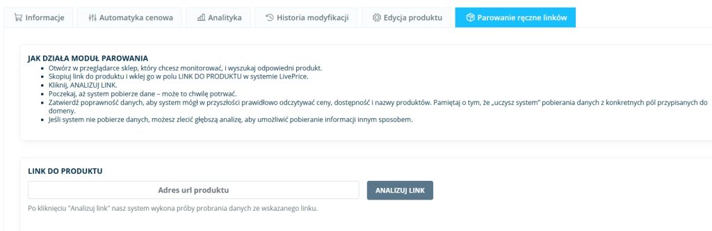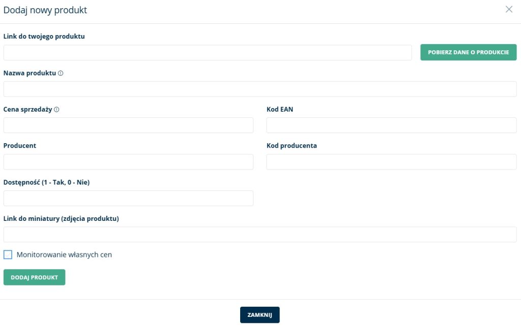 - Dodajesz do swojego asortymentu linki konkurencji – wklejasz adres URL produktu z dowolnego sklepu.