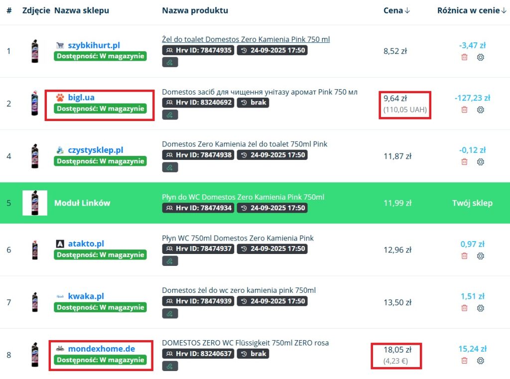 - dostępność – informacja czy produkt jest aktualnie dostępny w ofercie konkurenta.