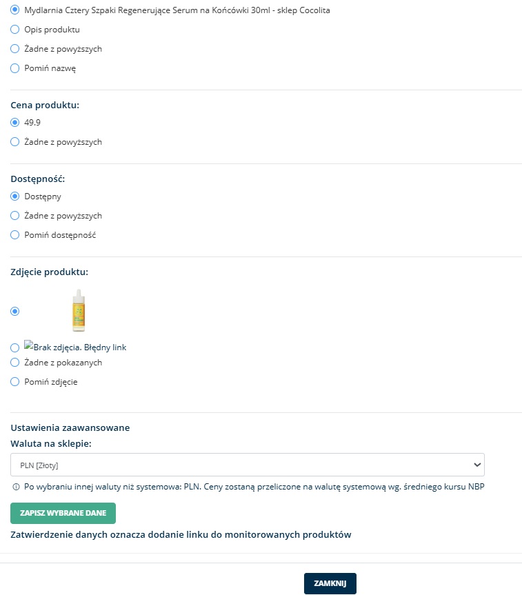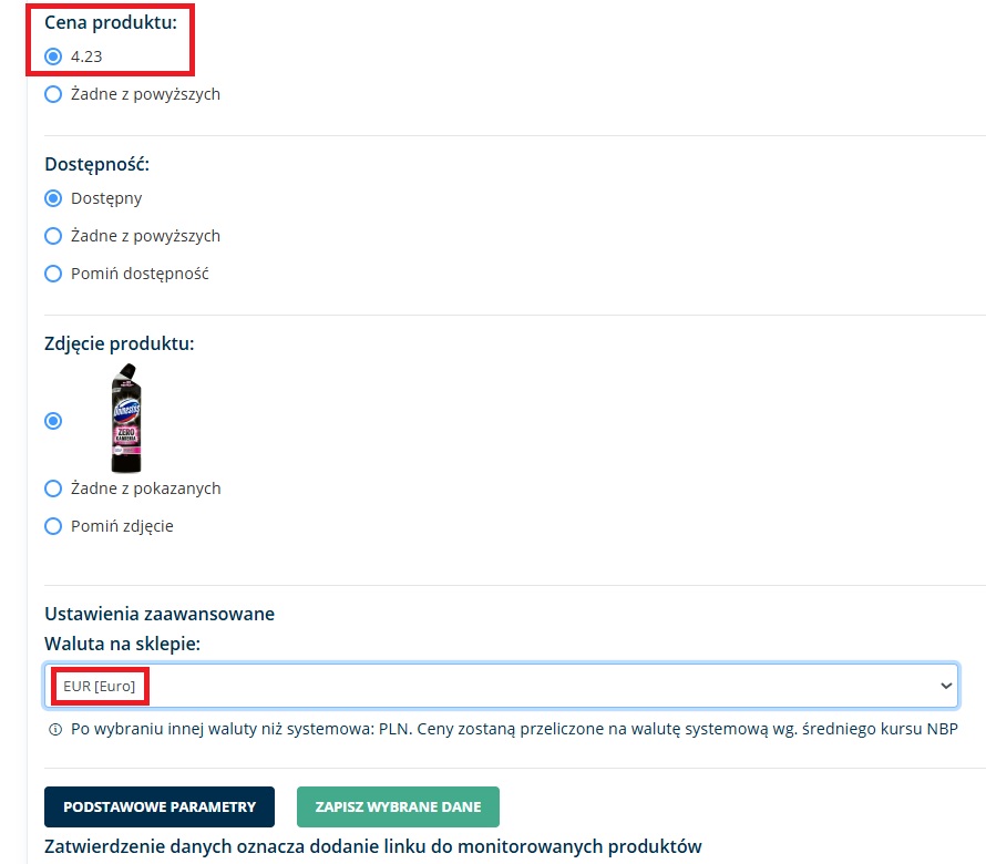 Wystarczy, że ustawisz walutę domeny, z której pobierasz dane, a system automatycznie zestawi produkty na karcie i przeliczy ceny według kursu NBP.