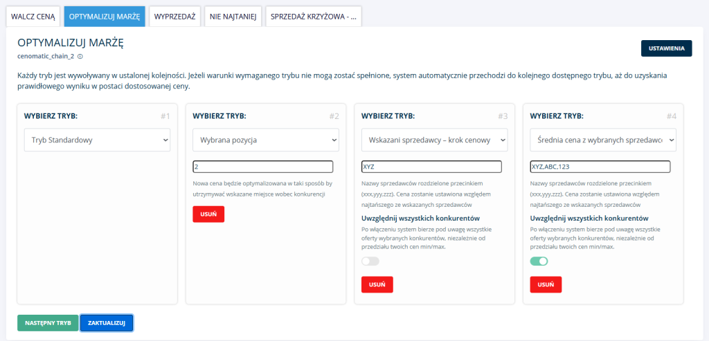 Co więcej, w systemie możesz zdefiniować aż 5 poziomów łańcucha, co daje ogromną elastyczność i pozwala budować zaawansowane strategie dopasowane do różnych scenariuszy rynkowych. Dzięki temu Twoja polityka cenowa w e-commerce jest stabilna i przemyślana.